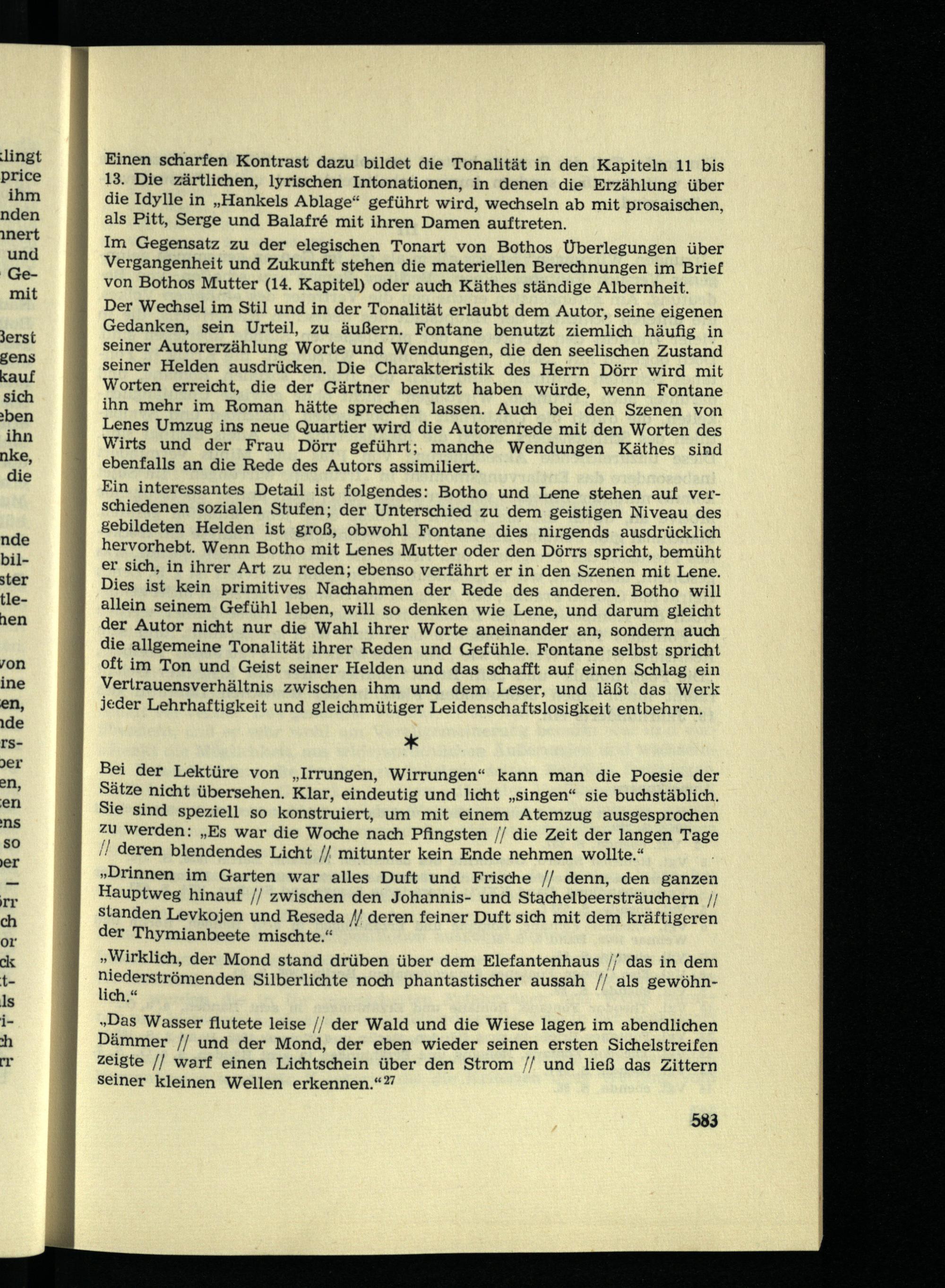 Ein interessantes Detail ist folgendes: Botho und Lene stehen auf verschiedenen sozialen Stufen; der Unterschied zu dem geistigen Niveau des gebildeten Helden ist groß, obwohl Fontane dies nirgends ausdrücklich hervorhebt. Wenn Botho mit Lenes Mutter oder den Dörrs spricht, bemüht er sich, in ihrer Art zu reden; ebenso verfährt er in den Szenen mit Lene. Dies ist kein primitives Nachahmen der Rede des anderen. Botho will allein seinem Gefühl leben, will so denken wie Lene, und darum gleicht der Autor nicht nur die Wahl ihrer Worte aneinander an, sondern auch die allgemeine Tonalität ihrer Reden und Gefühle. Fontane selbst spricht oft im Ton und Geist seiner Helden und das schafft auf einen Schlag ein Vertrauensverhältnis zwischen ihm und dem Leser, und läßt das Werk jeder Lehrhaftigkeit und gleichmütiger Leidenschaftslosigkeit entbehren.