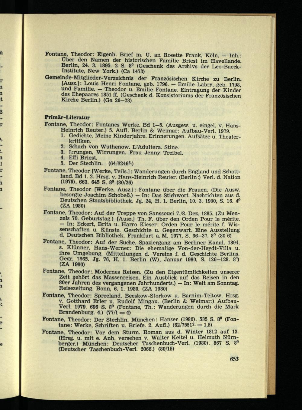 Fontane. Theodor: Auf der Treppe von Sanssouci 7./8. Dez. 1885. (Zu Menzels 70. Geburtstag.) [Ausz.] Th. F. über den Orden Pour le merile. — In: Eckert, Brita u. Harro Kieser: Orden Pour le mörite f. Wissenschaften u. Künste. Geschichte u. Gegenwart. Eine Ausstellung d. Deutschen Bibliothek. Frankfurt a. M. 1977, S. 36-37. 8° (80 6) Fontane, Theodor: Auf der Suche. Spaziergang am Berliner Kanal. 1894, s. Klünner. Hans-Werner: Die ehemalige Von-der-Heydt-Villa u. ihre Umgebung. (Mitteilungen d. Vereins f. d. Geschichte Berlins. Gegr. 1865. Jg. 76, H. 1. Berlin (W), Januar 1980, S. 126-128. 8 n ) (ZA 1980)