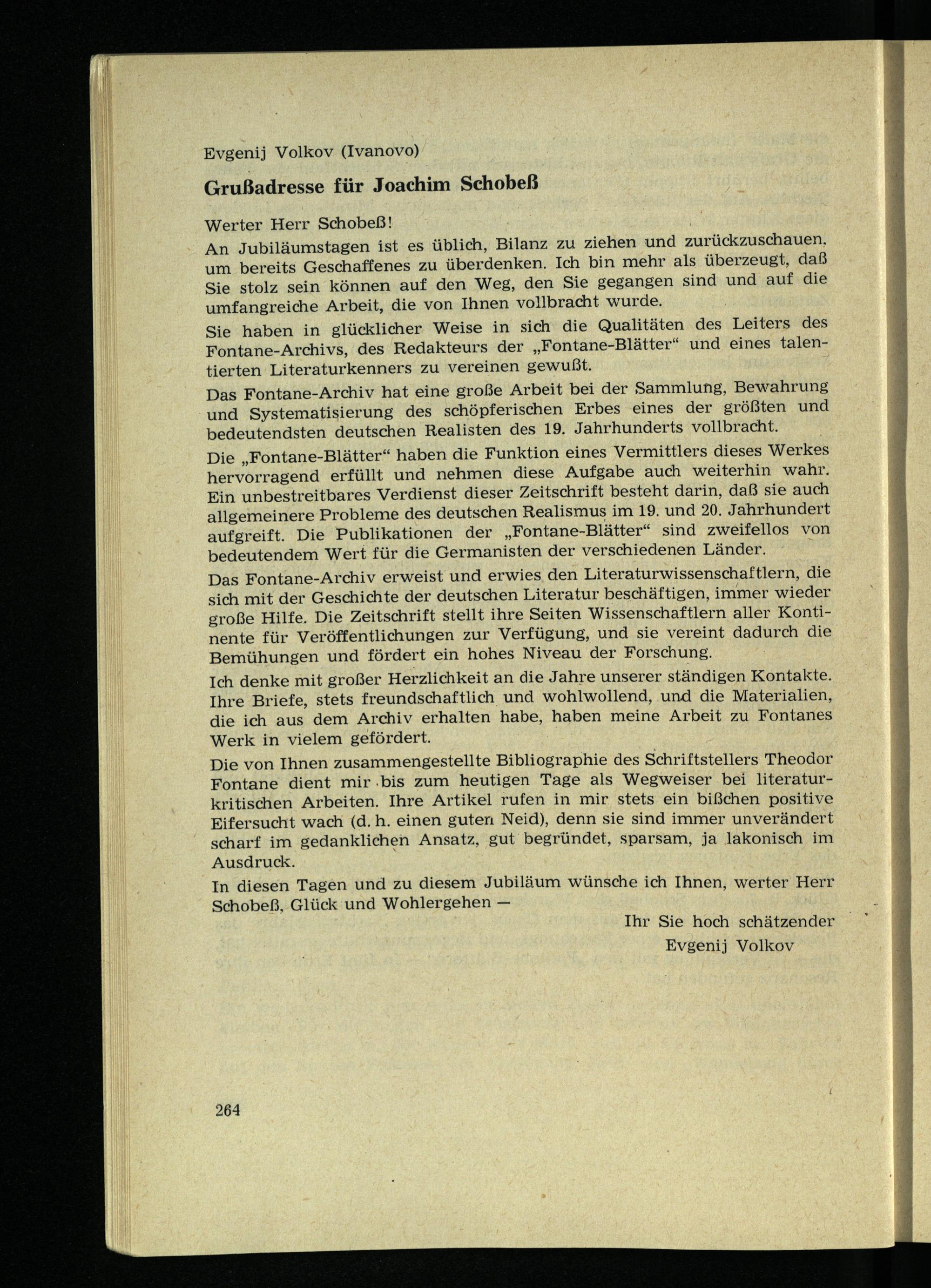 Ich denke mit großer Herzlichkeit an die Jahre unserer ständigen Kontakte. Ihre Briefe, stets freundschaftlich und wohlwollend, und die Materialien, die ich aus dem Archiv erhalten habe, haben meine Arbeit zu Fontanes Werk in vielem gefördert.