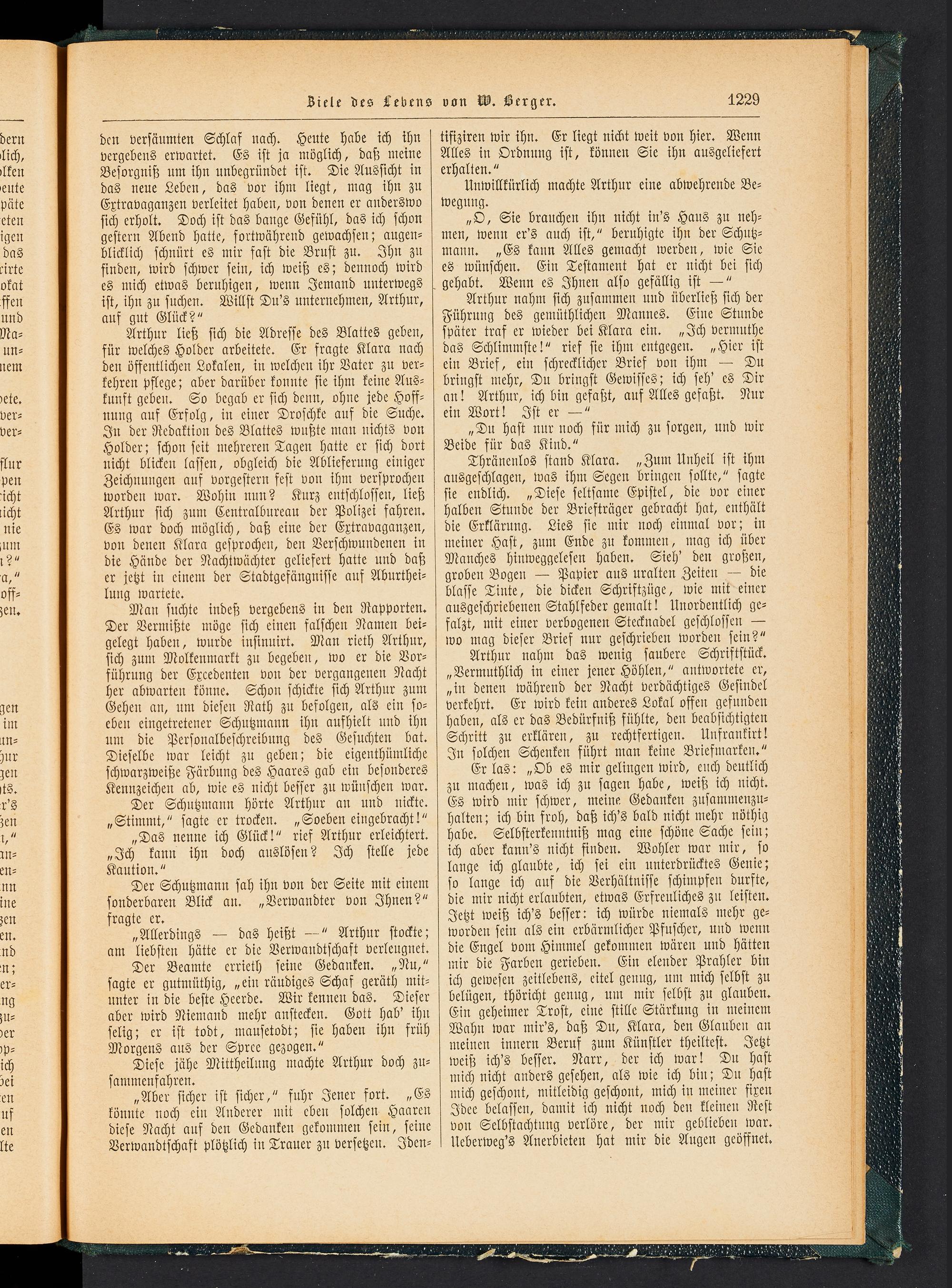 Man suchte indeß vergebens in den Rapporten. Der Vermißte möge sich einen falschen Namen beigelegt haben, wurde insinuirt. Man rieth Arthur, sich zum Molkenmarkt zu begeben, wo er die Vorführung der Excedenten von der vergangenen Nacht her abwarten könne. Schon schickte sich Arthur zum Gehen au, um diesen Rath zu befolgen, als ein soeben eingetretener Schutzmann ihn aufhielt und ihn um die Personalbeschreibung des Gesuchten bat. Dieselbe war leicht zu geben; die eigenthümliche schwarzweiße Färbung des Haares gab ein besonderes Kennzeichen ab, wie es nicht besser zu wünschen war.