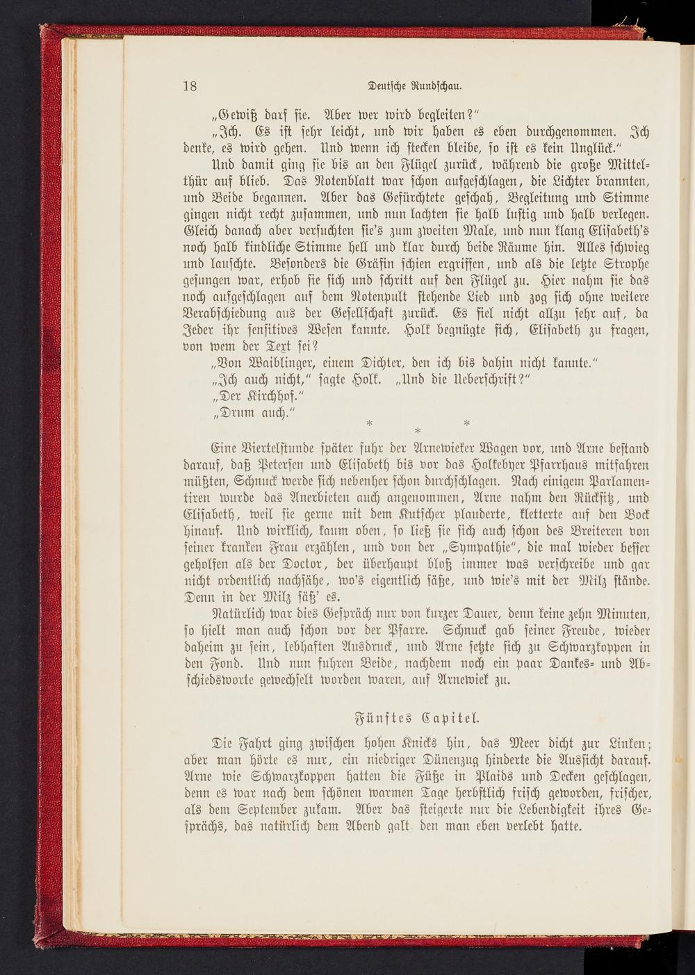 Eine Viertelstunde später fuhr der Arnewieker Wagen vor, und Arne bestand darauf, daß Petersen und Elisabeth bis vor das Holkebyer Pfarrhaus mitfahren müßten, Schnuck Werde sich nebenher schon durchschlagen. Nach einigem Parlamen- tiren wurde das Anerbieten auch angenommen, Arne nahm den Rücksitz, und Elisabeth, weil sie gerne mit dem Kutscher plauderte, kletterte aus den Bock hinauf. Und wirklich, kaum oben, so ließ sie sich auch schon des Breiteren von seiner kranken Frau erzählen, und von der „Sympathie", die mal wieder besser geholfen als der Doctor, der überhaupt bloß immer was verschreibe und gar nicht ordentlich nachsähe, wo's eigentlich säße, und wie's mit der Milz stände. Denn in der Milz säß' es.