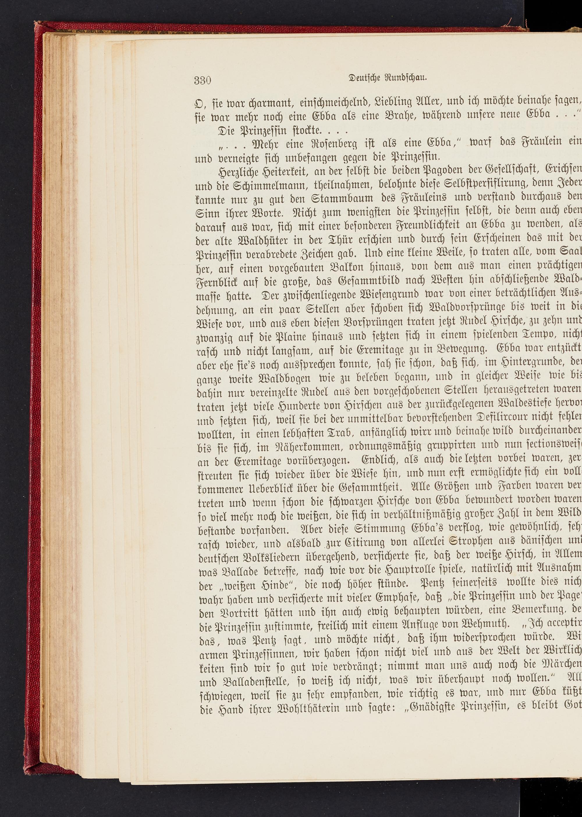 Herzliche Heiterkeit, an der selbst die beiden Pagoden der Gesellschaft, Erichsen und die Schimmelmann, theilnahmen, belohnte diese Selbstpersislirung, denn Jeder kannte nur zu gut den Stammbaum des Fräuleins und verstand durchaus den Sinn ihrer Worte. Nicht zum wenigsten die Prinzessin selbst, die denn auch eben darauf aus war, sich mit einer besonderen Freundlichkeit an Ebba zu wenden, als der alte Waldhüter in der Thür erschien und durch sein Erscheinen das mit der Prinzessin verabredete Zeichen gab. Und eine kleine Weile, so traten alle, vom Saal her, auf einen vorgebauten Balkon hinaus, von dem aus man einen prächtigen Fernblick auf die große, das Gesammtbild nach Westen hin abschließende Waldmasse hatte. Der zwischenliegende Wiesengrund war von einer beträchtlichen Ausdehnung, an ein paar Stellen aber schoben sich Waldvorsprünge bis weit in du Wiese vor, und aus eben diesen Vorsprüngen traten jetzt Rudel Hirsche, zu zehn unk zwanzig aus die Plaine hinaus und setzten sich in einem spielenden Tempo, nicht rasch und nicht langsam, auf die Eremitage zu in Bewegung. Ebba war entzückt aber ehe sie's noch aussprechen konnte, sah sie schon, daß sich, im Hintergründe, dei ganze weite Waldbogen wie zu beleben begann, und in gleicher Weise wie bn dahin nur vereinzelte Rudel aus den vorgeschobenen Stellen herausgetreten waren traten jetzt viele Hunderte von Hirschen aus der zurückgelegenen Waldestiefe hervoi und setzten sich, Weil sie bei der unmittelbar bevorstehenden Defilircour nicht fehler wollten, in einen lebhaften Trab, anfänglich wirr und beinahe wild durcheinander bis sie sich, im Näherkommen, ordnungsmäßig gruppirten und nun sectionsweiß an der Eremitage vorüberzogen. Endlich, als auch die letzten vorbei waren, zer streuten sie sich wieder über die Wiese hin, und nun erst ermöglichte sich ein voll kommener Ueberblick über die Gesammtheit. Alle Größen und Farben waren ver treten und wenn schon die schwarzen Hirsche von Ebba bewundert worden waren so viel mehr noch die Weißen, die sich in verhältnißmäßig großer Zahl in dem Wild bestände vorfanden. Aber diese Stimmung Ebba's verflog, wie gewöhnlich, seh' rasch wieder, und alsbald zur Citirung von allerlei Strophen aus dänischen uni deutschen Volksliedern übergehend, versicherte sie, daß der Weiße Hirsch, in Allem Was Ballade betreffe, nach wie vor die Hauptrolle spiele, natürlich mit Ausnahm der „Weißen Hinde", die noch höher stünde. Pentz seinerseits wollte dies nich wahr haben und versicherte mit vieler Emphase, daß „die Prinzessin und der Page' den Vortritt hätten und ihn auch ewig behaupten würden, eine Bemerkung, de die Prinzessin zustimmte, freilich mit einem Ansluge von Wehmuth. „Ich acceptir das, was Pentz sagt, und möchte nicht, daß ihm widersprochen würde. Wi armen Prinzessinnen, wir haben schon nicht viel und aus der Welt der Wirklich keiten sind wir so gut wie verdrängt; nimmt man uns auch noch die Märchen und Balladenstelle, so weiß ich nicht, was wir überhaupt noch wollen." All schwiegen, weil sie zu sehr empfanden, wie richtig es war, und nur Ebba küßt die Hand ihrer Wohlthäterin und sagte: „Gnädigste Prinzessin, es bleibt Got