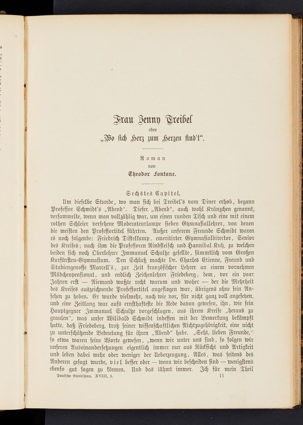Um dieselbe Stunde, wo man sich bei Treibel's vom Diner erhob, begann Professor Schmidt's „Abend". Dieser „Abend", auch Wohl Kränzchen genannt, versammelte, wenn man vollzählig war, um einen runden Tisch und eine mit einem rothen Schleier versehene Moderateurlampe sieben Gymnasiallehrer, von denen die meisten den Professortitel führten. Außer unserem Freunde Schmidt waren es noch folgende: Friedrich Distelkamp, emeritirter Gymnasialdirector, Senior des Kreises; nach ihm die Professoren Rindfleisch und Hannibal Kuh, zu welchen beiden sich noch Oberlehrer Immanuel Schultze gesellte, sämmtlich vom Großen Kurfürsten-Gymnasium. Den Schluß machte vr. Charles Etienne, Freund und Studiengenosse Marcell's, zur Zeit französischer Lehrer an einem vornehmen Mädchenpensionat, und endlich Zeichenlehrer Friedeberg, dem, vor ein paar Jahren erst — Niemand wußte recht warum und woher — der die Mehrheit des Kreises auszeichnende Professortitel angeflogen war, übrigens ohne sein Ansehen zu heben. Er wurde vielmehr, nach wie vor, für nicht ganz voll angesehen, und eine Zeitlang war aufs ernsthafteste die Rede davon gewesen, ihn, wie sein Hauptgegner Immanuel Schultze vorgeschlagen, aus ihrem Kreise „heraus zu graulen", was unser Wilibald Schmidt indessen mit der Bemerkung bekämpft hatte, daß Friedeberg, trotz seiner wissenschaftlichen Nichtzugehörigkeit, eine nicht zu unterschätzende Bedeutung für ihren „Abend" habe. „Seht, lieben Freunde," so etwa waren seine Worte gewesen, „wenn wir unter uns sind, so folgen wir unseren Auseinandersetzungen eigentlich immer nur aus Rücksicht und Artigkeit und leben dabei mehr oder weniger der Ueberzeugung, Alles, was seitens des Anderen gesagt wurde, viel besser oder — wenn wir bescheiden sind — wenigstens ebenso gut sagen zu können. Und das lähmt immer. Ich für mein Theil