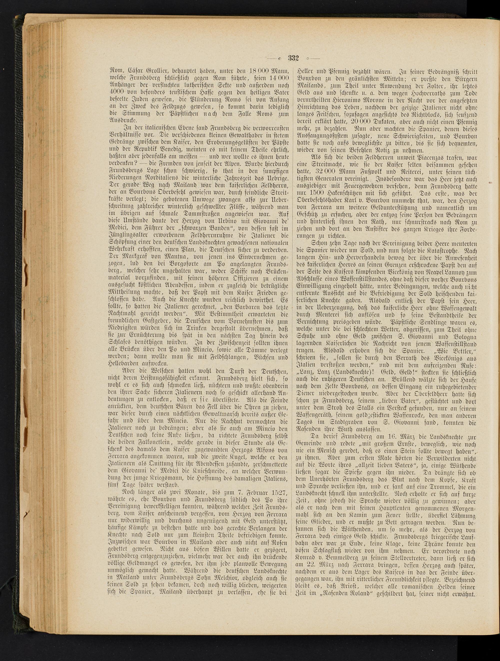 > sannen sich die Wüthenden, um so mehr, als der Herzog von ! Ferrara doch einiges Geld schickte. Frundsbergs kriegerische Lauf- ! bahn aber war zu Ende, keine Klage, keine Thräne konnte den
