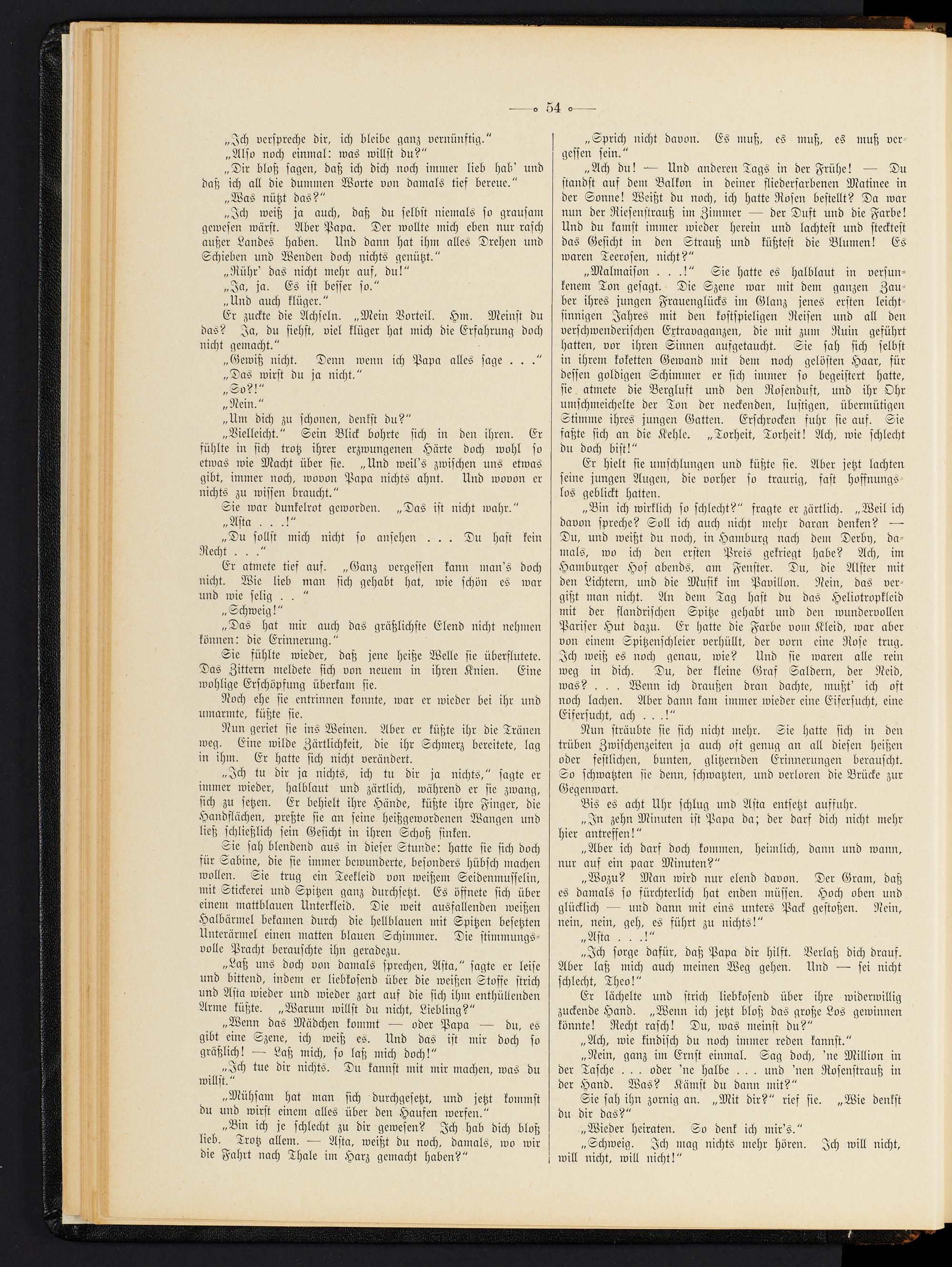 „Laß uns doch von damals sprechen, Asta," sagte er leise und bittend, indem er liebkosend über die weißen Stoffe strich und Asta wieder und wieder zart auf die sich ihm enthüllenden Arme küßte. „Warum willst du nicht, Liebling?"