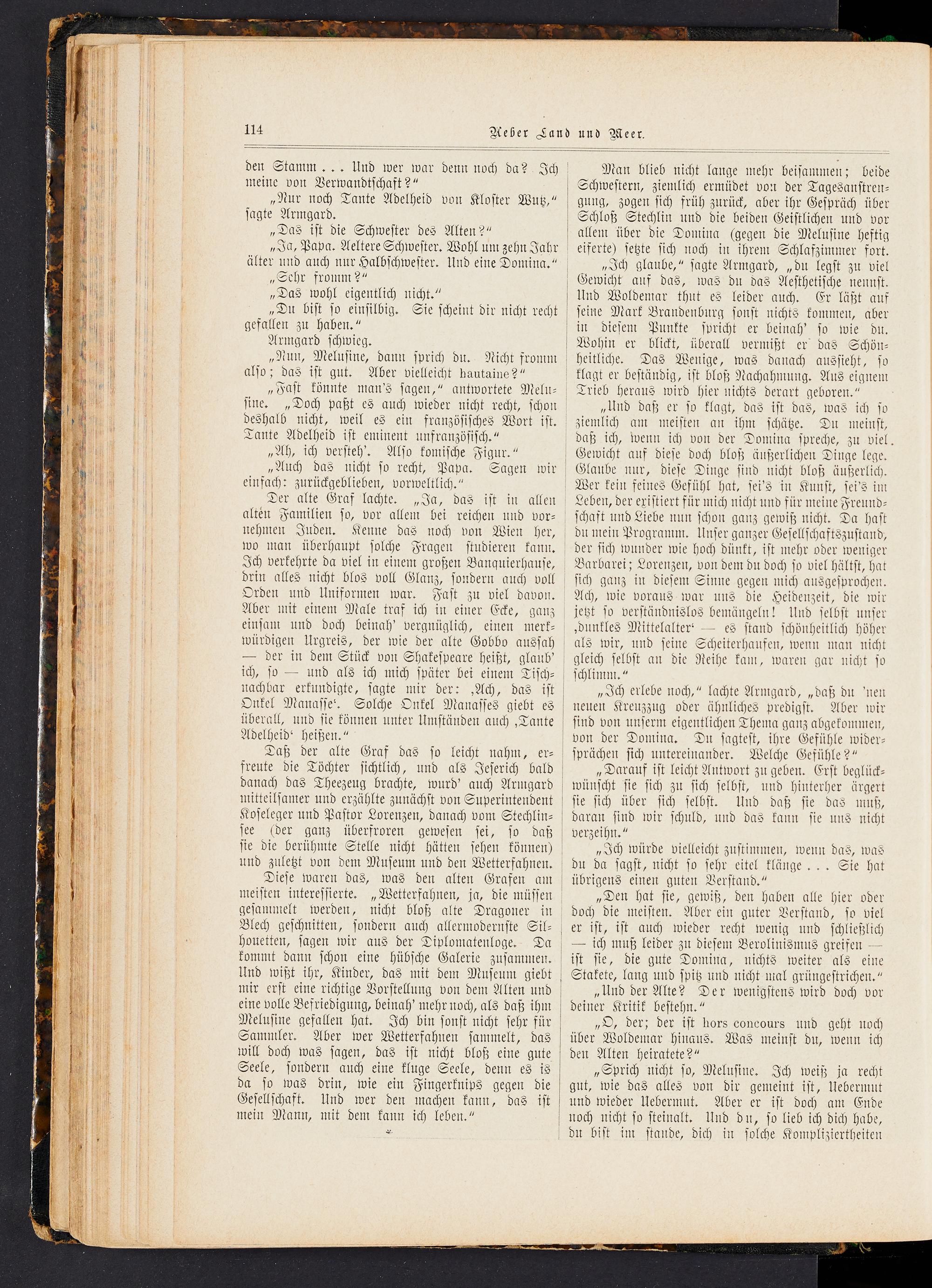 „Den hat sie, gewiß, den haben alle hier oder doch die meisten. Aber ein guter Verstand, so viel er ist, ist auch wieder recht wenig und schließlich — ich muß leider zu diesem Berolinismns greifen - - ist sie, die gute Domina, nichts weiter als eine Stakete, lang und spitz und nicht mal grüngestrichen."