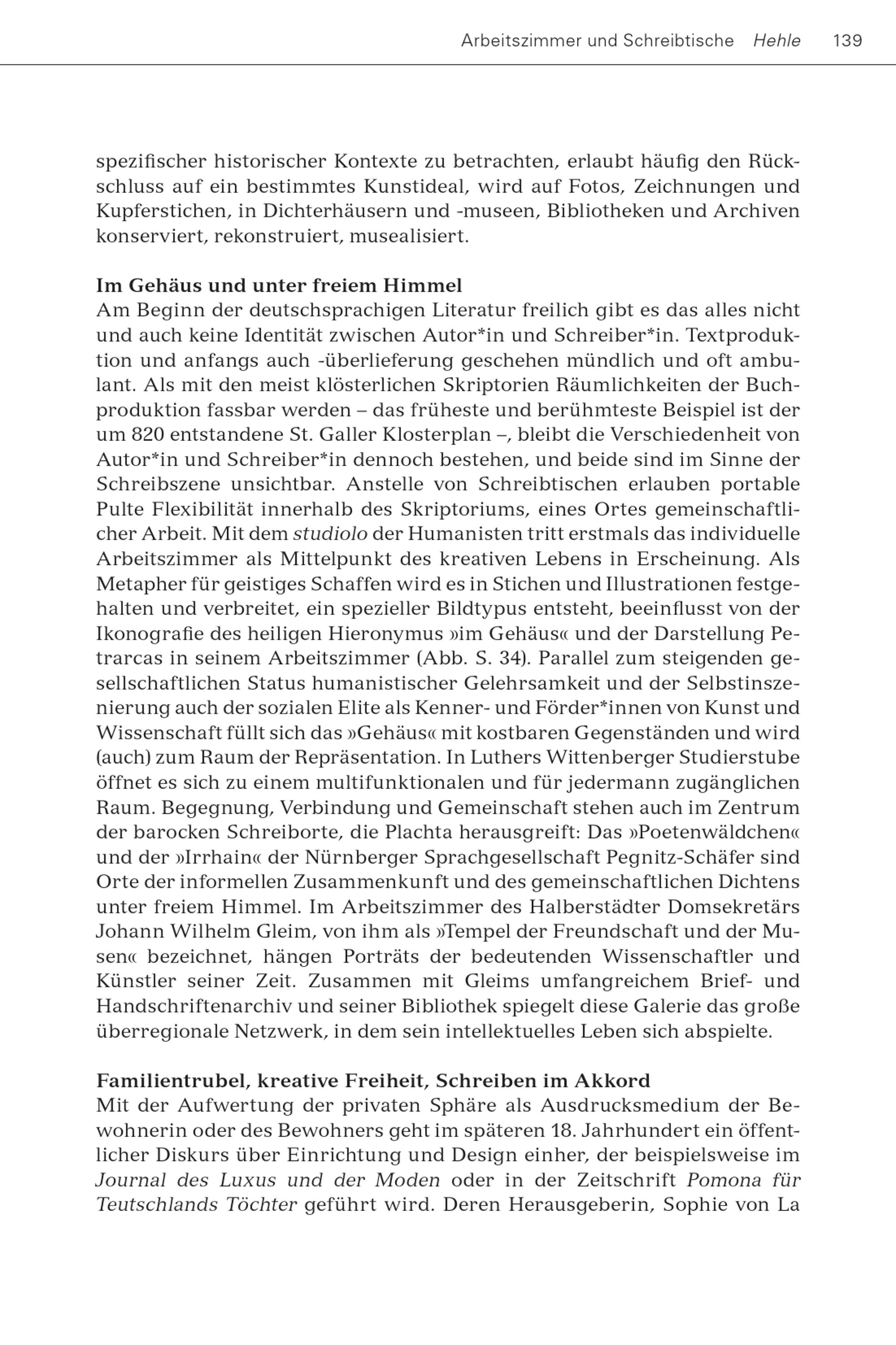 Arbeitszimmer und Schreibtische Hehle 139 spezifischer historischer Kontexte zu betrachten, erlaubt häufig den Rückschluss auf ein bestimmtes Kunstideal, wird auf Fotos, Zeichnungen und Kupferstichen, in Dichterhäusern und-museen, Bibliotheken und Archiven konserviert, rekonstruiert, musealisiert. Im Gehäus und unter freiem Himmel Am Beginn der deutschsprachigen Literatur freilich gibt es das alles nicht und auch keine Identität zwischen Autor*in und Schreiber*in. Textproduktion und anfangs auch-überlieferung geschehen mündlich und oft ambulant. Als mit den meist klösterlichen Skriptorien Räumlichkeiten der Buchproduktion fassbar werden – das früheste und berühmteste Beispiel ist der um 820 entstandene St. Galler Klosterplan –, bleibt die Verschiedenheit von Autor*in und Schreiber*in dennoch bestehen, und beide sind im Sinne der Schreibszene unsichtbar. Anstelle von Schreibtischen erlauben portable Pulte Flexibilität innerhalb des Skriptoriums, eines Ortes gemeinschaftlicher Arbeit. Mit dem studiolo der Humanisten tritt erstmals das individuelle Arbeitszimmer als Mittelpunkt des kreativen Lebens in Erscheinung. Als Metapher für geistiges Schaffen wird es in Stichen und Illustrationen festgehalten und verbreitet, ein spezieller Bildtypus entsteht, beeinflusst von der Ikonografie des heiligen Hieronymus»im Gehäus« und der Darstellung Petrarcas in seinem Arbeitszimmer(Abb. S. 34). Parallel zum steigenden gesellschaftlichen Status humanistischer Gelehrsamkeit und der Selbstinszenierung auch der sozialen Elite als Kenner- und Förder*innen von Kunst und Wissenschaft füllt sich das»Gehäus« mit kostbaren Gegenständen und wird (auch) zum Raum der Repräsentation. In Luthers Wittenberger Studierstube öffnet es sich zu einem multifunktionalen und für jedermann zugänglichen Raum. Begegnung, Verbindung und Gemeinschaft stehen auch im Zentrum der barocken Schreiborte, die Plachta herausgreift: Das»Poetenwäldchen« und der»Irrhain« der Nürnberger Sprachgesellschaft Pegnitz-Schäfer sind Orte der informellen Zusammenkunft und des gemeinschaftlichen Dichtens unter freiem Himmel. Im Arbeitszimmer des Halberstädter Domsekretärs Johann Wilhelm Gleim , von ihm als»Tempel der Freundschaft und der Musen« bezeichnet, hängen Porträts der bedeutenden Wissenschaftler und Künstler seiner Zeit. Zusammen mit Gleims umfangreichem Brief- und Handschriftenarchiv und seiner Bibliothek spiegelt diese Galerie das große überregionale Netzwerk, in dem sein intellektuelles Leben sich abspielte. Familientrubel, kreative Freiheit, Schreiben im Akkord Mit der Aufwertung der privaten Sphäre als Ausdrucksmedium der Bewohnerin oder des Bewohners geht im späteren 18. Jahrhundert ein öffentlicher Diskurs über Einrichtung und Design einher, der beispielsweise im Journal des Luxus und der Moden oder in der Zeitschrift Pomona für Teutschlands Töchter geführt wird. Deren Herausgeberin, Sophie von La