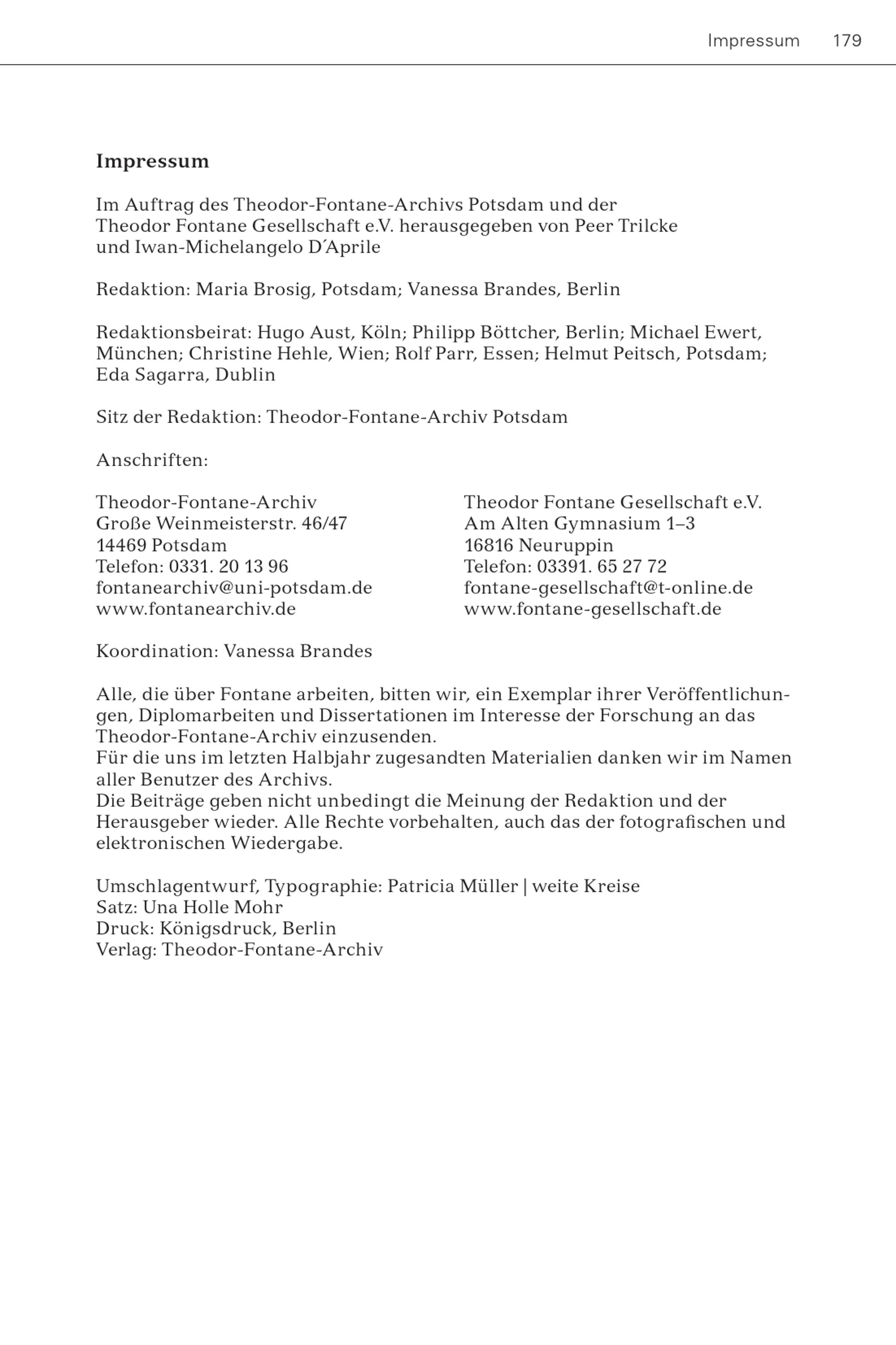 Impressum 179 Impressum Im Auftrag des Theodor-Fontane-Archivs Potsdam und der Theodor Fontane Gesellschaft e.V. herausgegeben von Peer Trilcke und Iwan-Michelangelo D´Aprile Redaktion: Maria Brosig, Potsdam ; Vanessa Brandes, Berlin Redaktionsbeirat: Hugo Aust , Köln ; Philipp Böttcher, Berlin ; Michael Ewert, München ; Christine Hehle, Wien ; Rolf Parr , Essen; Helmut Peitsch , Potsdam ; Eda Sagarra , Dublin Sitz der Redaktion: Theodor-Fontane-Archiv Potsdam Anschriften: Theodor-Fontane-Archiv Große Weinmeisterstr. 46/47 14469 Potsdam Telefon: 0331. 20 13 96 fontanearchiv@uni-potsdam.de www.fontanearchiv.de Theodor Fontane Gesellschaft e.V. Am Alten Gymnasium 1–3 16816 Neuruppin Telefon: 03391. 65 27 72 fontane-gesellschaft@t-online.de www.fontane-gesellschaft.de Koordination: Vanessa Brandes Alle, die über Fontane arbeiten, bitten wir, ein Exemplar ihrer Veröffentlichungen, Diplomarbeiten und Dissertationen im Interesse der Forschung an das Theodor-Fontane-Archiv einzusenden. Für die uns im letzten Halbjahr zugesandten Materialien danken wir im Namen aller Benutzer des Archivs. Die Beiträge geben nicht unbedingt die Meinung der Redaktion und der Herausgeber wieder. Alle Rechte vorbehalten, auch das der fotografischen und elektronischen Wiedergabe. Umschlagentwurf, Typographie: Patricia Müller| weite Kreise Satz: Una Holle Mohr Druck: Königsdruck, Berlin Verlag: Theodor-Fontane-Archiv