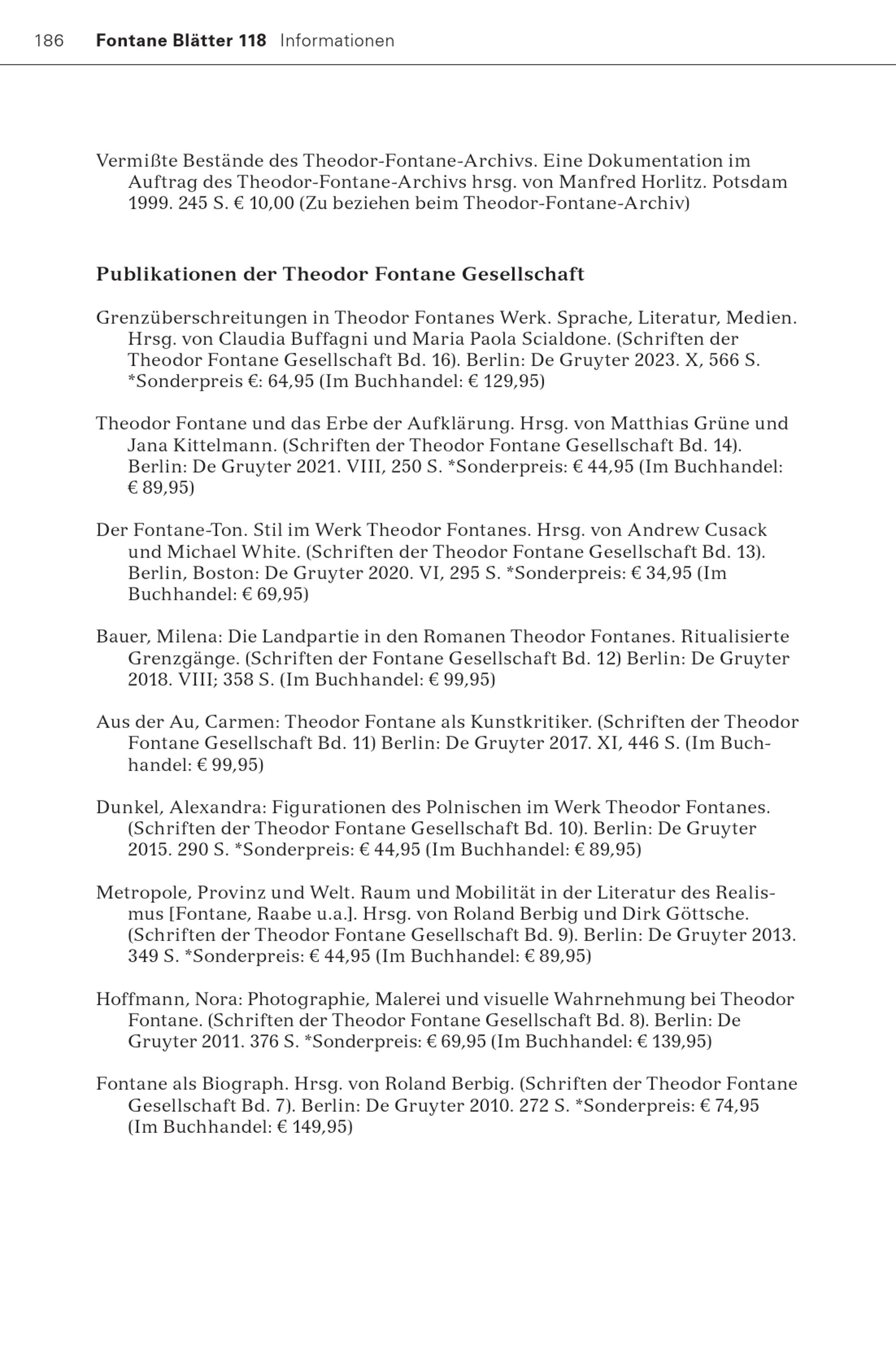 186 Fontane Blätter 118 Informationen Vermißte Bestände des Theodor-Fontane-Archivs. Eine Dokumentation im Auftrag des Theodor-Fontane-Archivs hrsg. von Manfred Horlitz. Potsdam 1999. 245 S.€ 10,00(Zu beziehen beim Theodor-Fontane-Archiv ) Publikationen der Theodor Fontane Gesellschaft Grenzüberschreitungen in Theodor Fontanes Werk. Sprache, Literatur, Medien. Hrsg. von Claudia Buffagni und Maria Paola Scialdone.(Schriften der Theodor Fontane Gesellschaft Bd. 16). Berlin : De Gruyter 2023. X, 566 S. *Sonderpreis€: 64,95(Im Buchhandel:€ 129,95) Theodor Fontane und das Erbe der Aufklärung. Hrsg. von Matthias Grüne und Jana Kittelmann.(Schriften der Theodor Fontane Gesellschaft Bd. 14). Berlin : De Gruyter 2021. VIII, 250 S.*Sonderpreis:€ 44,95(Im Buchhandel: € 89,95) Der Fontane -Ton. Stil im Werk Theodor Fontanes. Hrsg. von Andrew Cusack und Michael White.(Schriften der Theodor Fontane Gesellschaft Bd. 13). Berlin , Boston : De Gruyter 2020. VI, 295 S.*Sonderpreis:€ 34,95(Im Buchhandel:€ 69,95) Bauer, Milena: Die Landpartie in den Romanen Theodor Fontanes. Ritualisierte Grenzgänge.(Schriften der Fontane Gesellschaft Bd. 12) Berlin : De Gruyter 2018. VIII; 358 S.(Im Buchhandel:€ 99,95) Aus der Au, Carmen: Theodor Fontane als Kunstkritiker.(Schriften der Theodor Fontane Gesellschaft Bd. 11) Berlin : De Gruyter 2017. XI, 446 S.(Im Buchhandel:€ 99,95) Dunkel, Alexandra: Figurationen des Polnischen im Werk Theodor Fontanes. (Schriften der Theodor Fontane Gesellschaft Bd. 10). Berlin : De Gruyter 2015. 290 S.*Sonderpreis:€ 44,95(Im Buchhandel:€ 89,95) Metropole, Provinz und Welt. Raum und Mobilität in der Literatur des Realismus[Fontane , Raabe u.a.]. Hrsg. von Roland Berbig und Dirk Göttsche. (Schriften der Theodor Fontane Gesellschaft Bd. 9). Berlin : De Gruyter 2013. 349 S.*Sonderpreis:€ 44,95(Im Buchhandel:€ 89,95) Hoffmann, Nora: Photographie, Malerei und visuelle Wahrnehmung bei Theodor Fontane. (Schriften der Theodor Fontane Gesellschaft Bd. 8). Berlin : De Gruyter 2011. 376 S.*Sonderpreis:€ 69,95(Im Buchhandel:€ 139,95) Fontane als Biograph. Hrsg. von Roland Berbig. (Schriften der Theodor Fontane Gesellschaft Bd. 7). Berlin : De Gruyter 2010. 272 S.*Sonderpreis:€ 74,95 (Im Buchhandel:€ 149,95)